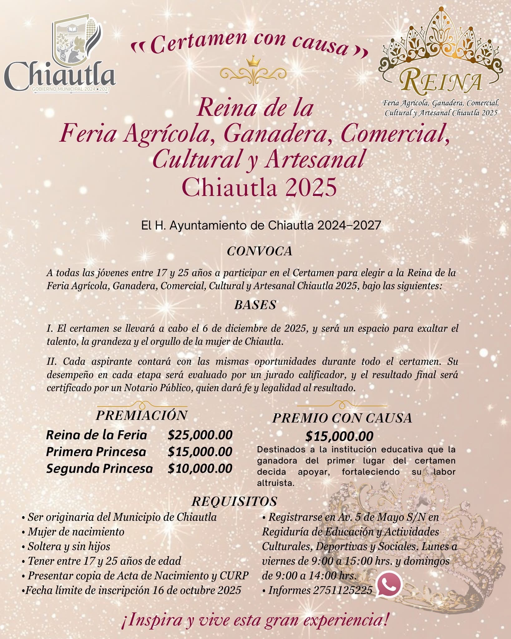 Tú puedes ser la próxima Reina de la Feria Agrícola, Ganadería, Comercial, Cultural y Artesanal Chiautla 2025