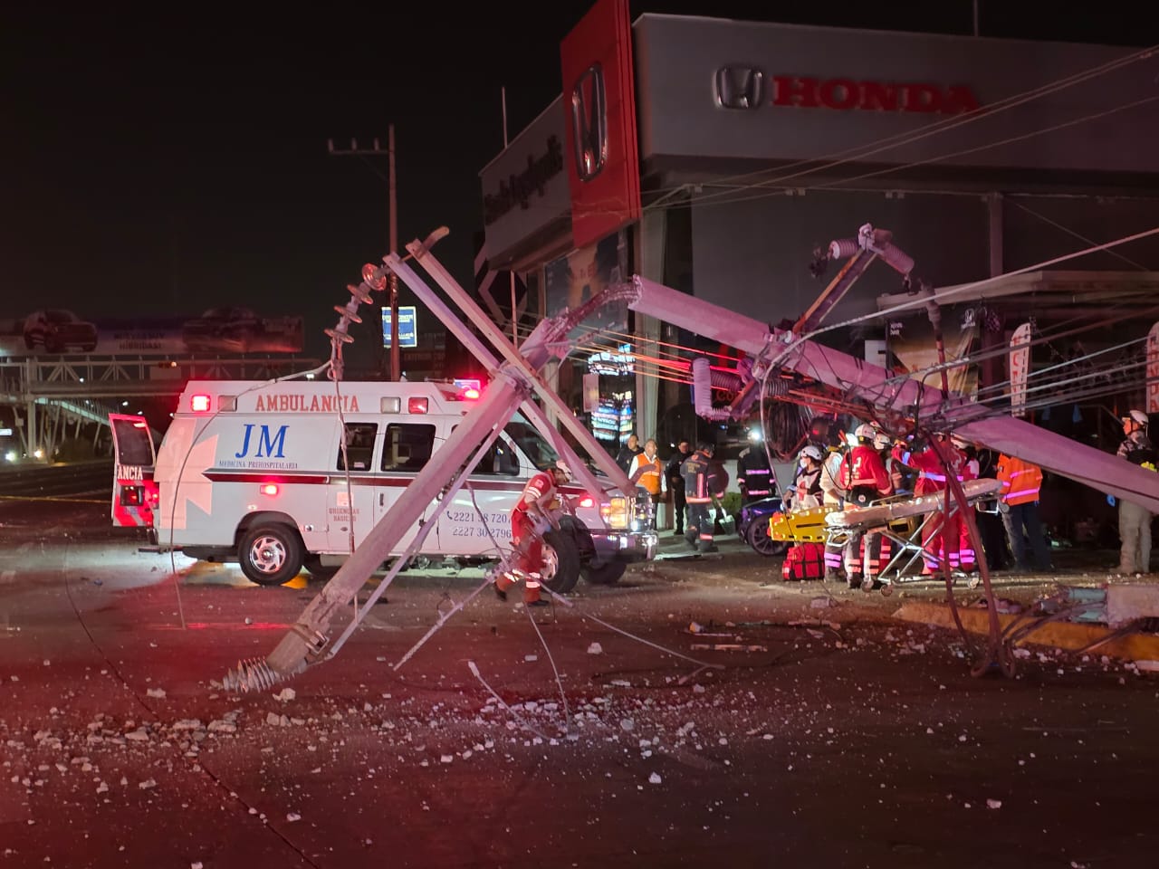 El impacto también provocó daños a dos postes de la CFE y el derribo de líneas eléctricas, lo que generó afectaciones en la zona. Fue uno de esos postes el que, al ceder, dejó sin luz por varios minutos parte del corredor Angelópolis.