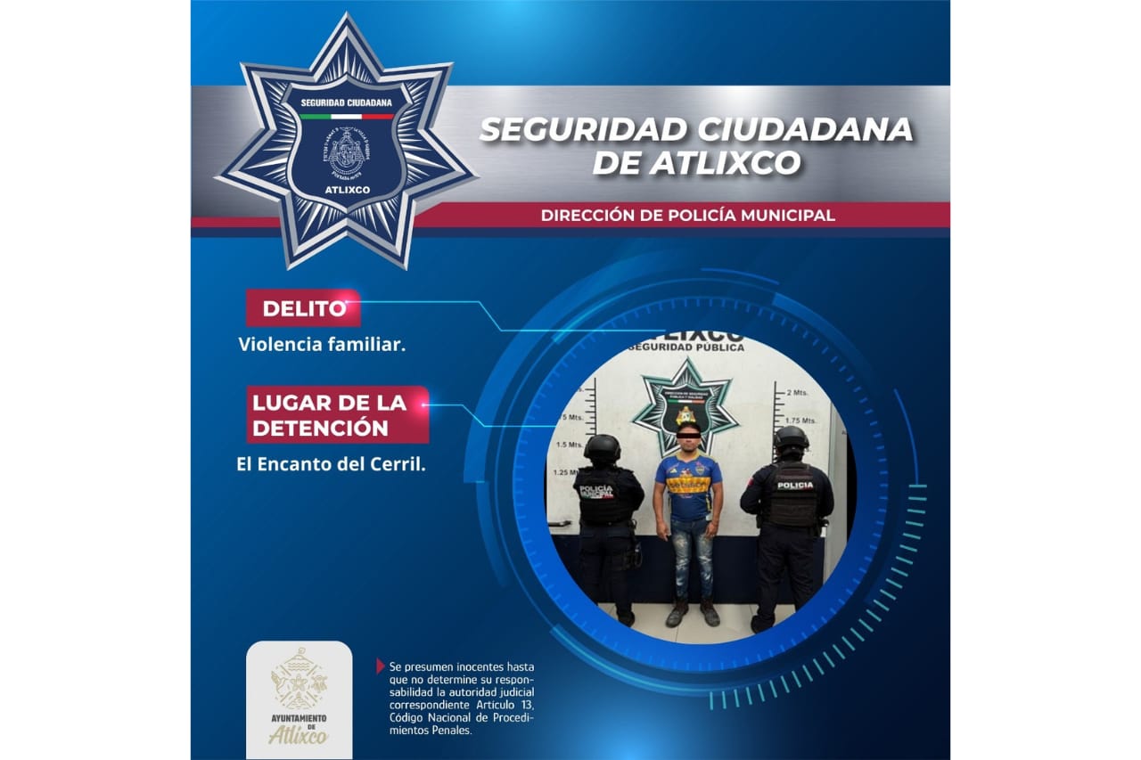 Elementos de la Secretaría de Seguridad Ciudadana de Atlixco aseguraron a un individuo señalado como presunto responsable del delito de violencia familiar, en hechos ocurridos en el fraccionamiento El Encanto del Cerril.