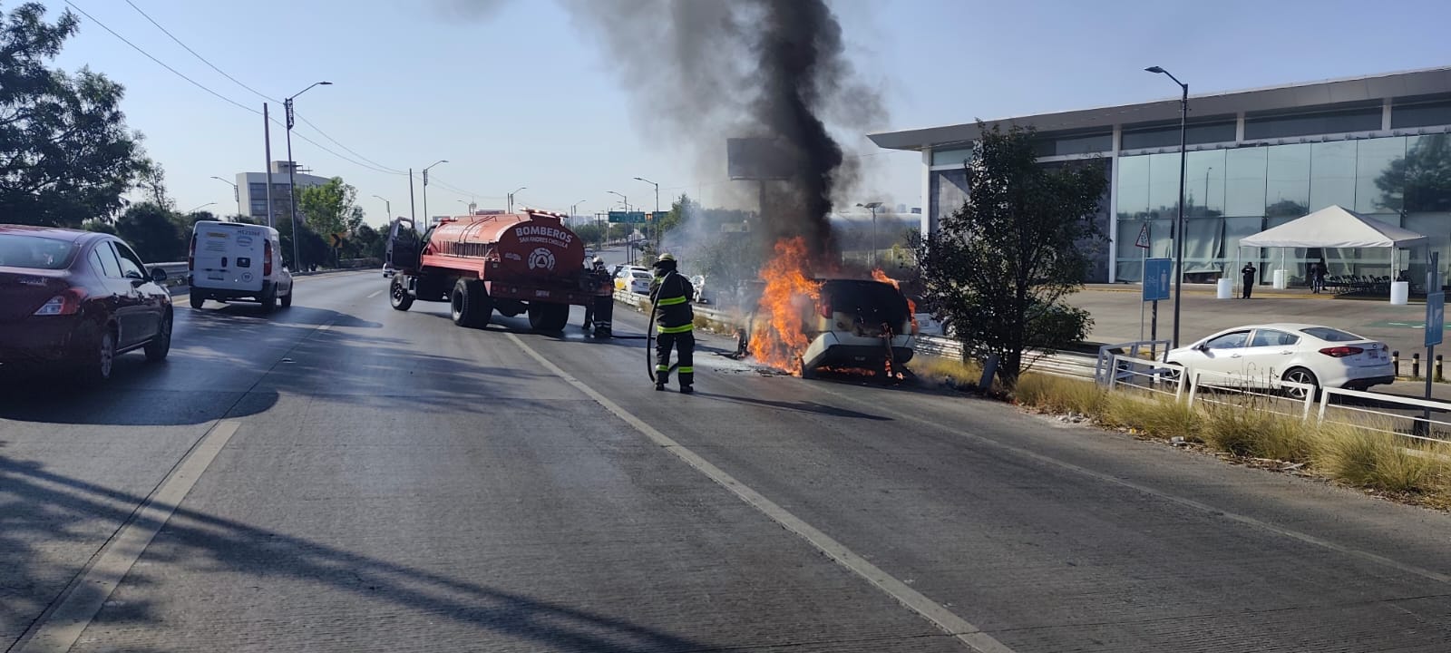 Los agentes intentaron controlar el siniestro con extinguidores, sin embargo, las llamas continuaron propagándose, por lo que se solicitó apoyo a los servicios de emergencia, mientras se realizaban maniobras de abanderamiento y desvío del tráfico para evitar otro percance, ya que la unidad se encontraba en uno de los carriles de circulación.