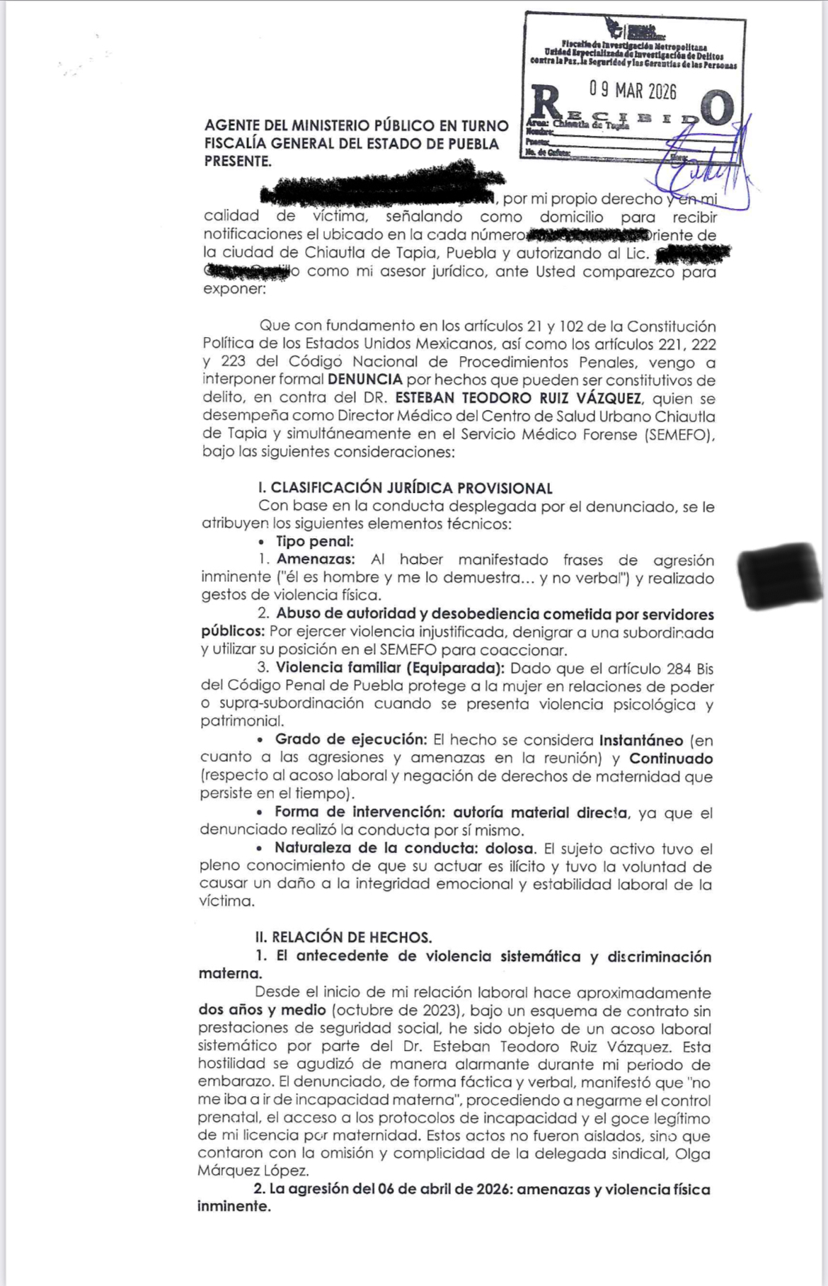En una denuncia presentada ante la Fiscalía General del Estado de Puebla, el 9 de marzo del 2026, en su relación de hechos menciona la denunciante que: