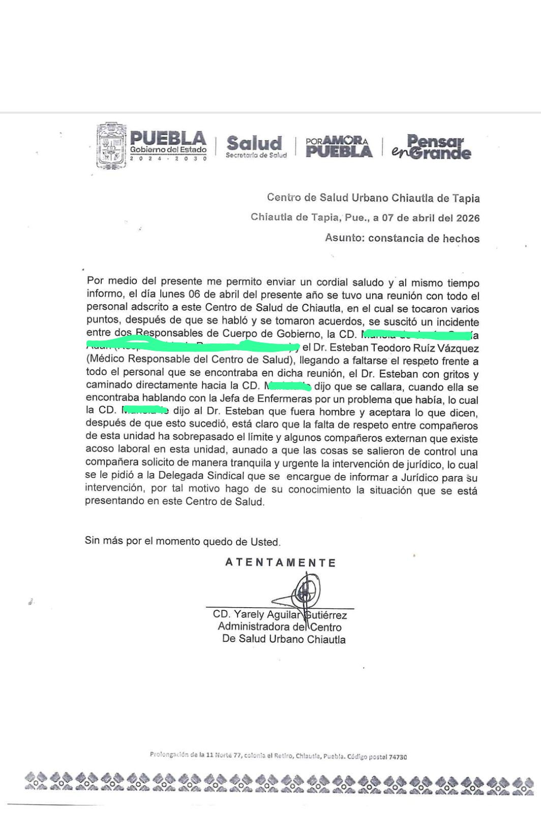 En un una constancia de hechos de fecha 7 de abril del 2026, levantada por la CD. Yarely Aguilar Gutiérrez Administradora del Centro de Salud Urbano de Chiautla de Tapia, hace constar que: