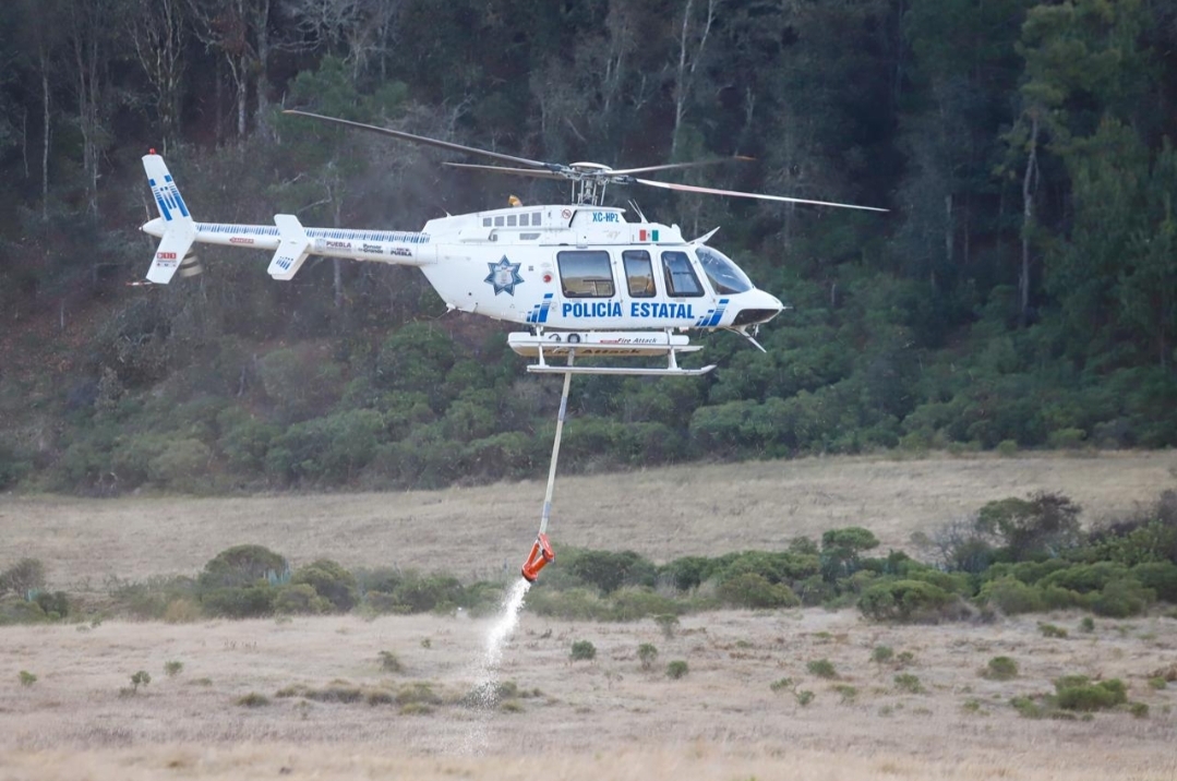 Gobernador Armenta sobrevuela incendio en Sierra Negra poblana; está controlado en 70%